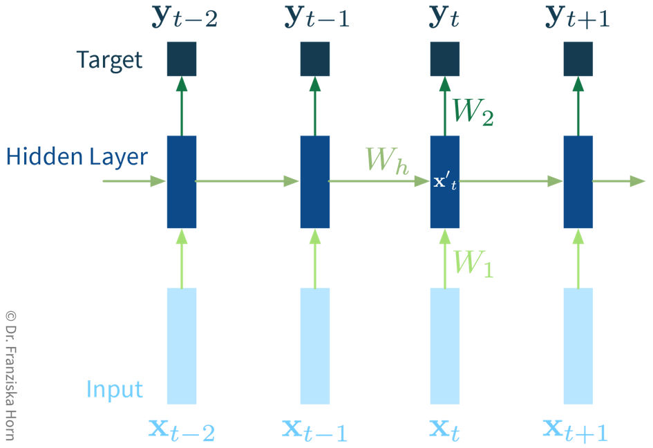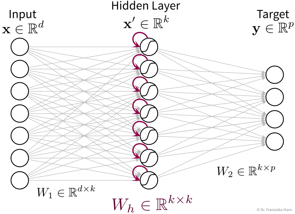 In its simplest form, a RNN is like a FFNN, but with additional recurrent connections \(W_h\) in the hidden layer to create a memory of the past: