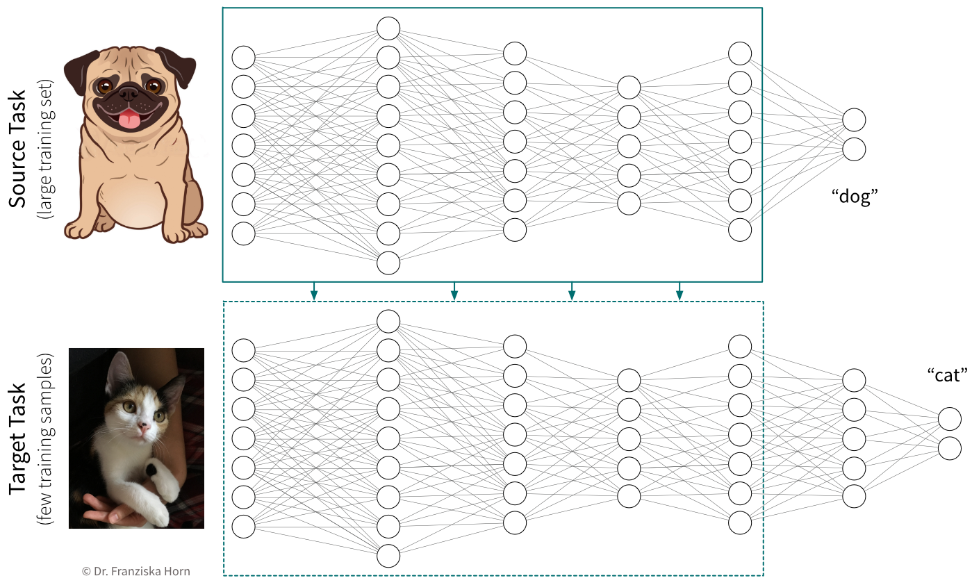 Typically, not all the weights of a target network are initialized with weights from a source network, but only those from the earlier layers, where the source network has learned some general principles that are not task specific (e.g., observe how the first layer of the CNN in the previous section had learned to detect edges, which seems like a relevant skill for pretty much all computer vision tasks). Often, using a pretrained network will give us a more robust solution and boost the prediction performance, especially if we only have a very small dataset for the target task available to train the network. However, since when training a neural network we’re trying to find weights that minimize the loss function by iteratively improving the weights starting with some initialization, if this initialization is unfavorable because it is very far away from a good minimum (i.e., further away than a random initialization), e.g., because we’ve initialized the weights with those from a source network trained on a very different task, then this can hurt the performance, since the network first has to unlearn a lot of things from this unrelated task before it can learn the actual task. Therefore, transfer learning should only be used if the source and target tasks are “related enough”. Pretraining a network on a self-supervised learning task (i.e., a task that is just about understanding the world in general, not solving a different kind of specific task) usually works quite well though.