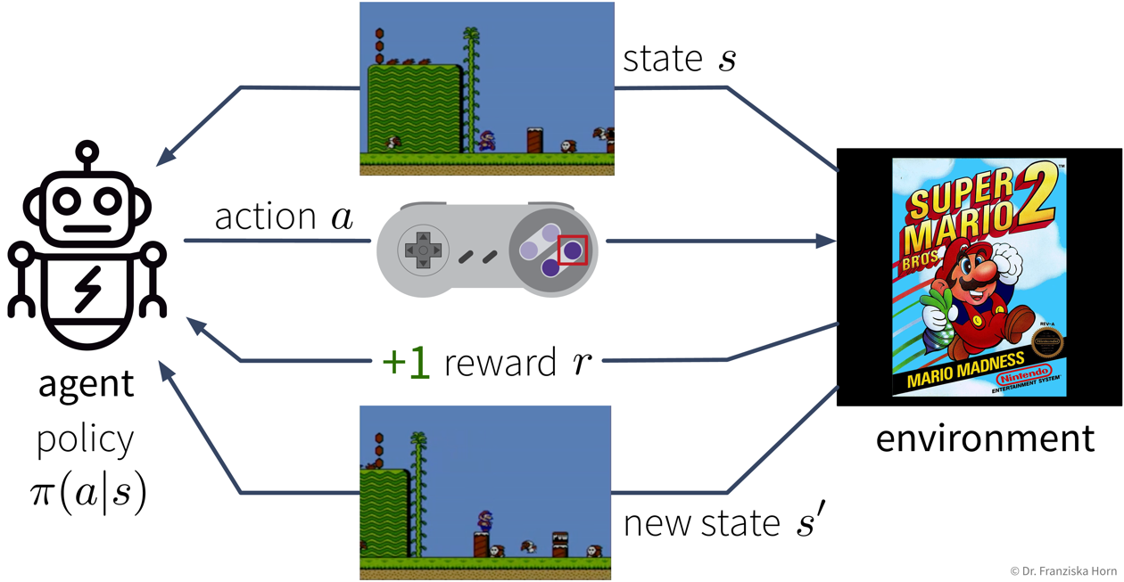 The difficult thing here is that sometimes an action might not result in a big immediate reward, but is still crucial for the agent’s long-term success (e.g., finding a key at the beginning of a level and the door for which we need the key comes much later). This means the agent needs to learn to perform an optimal sequence of actions from delayed labels.