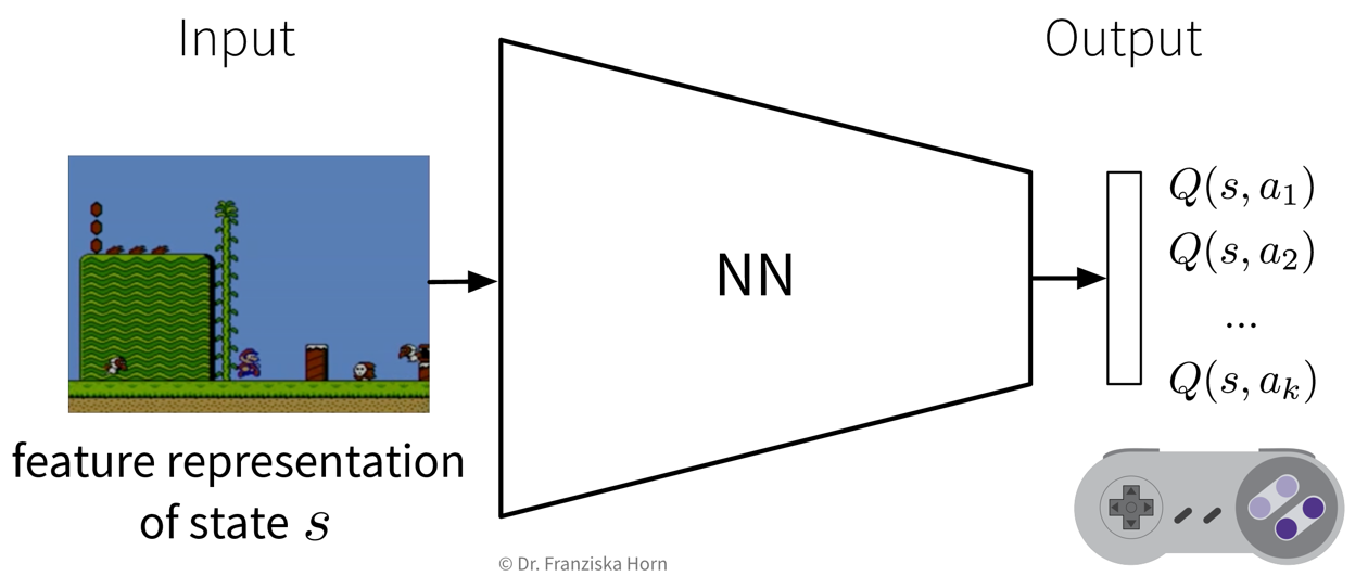 This can be seen as a direct extension of the tabular Q-learning: If we represented our states as one-hot encoded vectors and used a linear network with a single weight matrix that consisted of the Q-table we had constructed before, by multiplying the one-hot encoded vector with the Q-table, the network would “predict” the row containing the Q-values for all actions in this state.