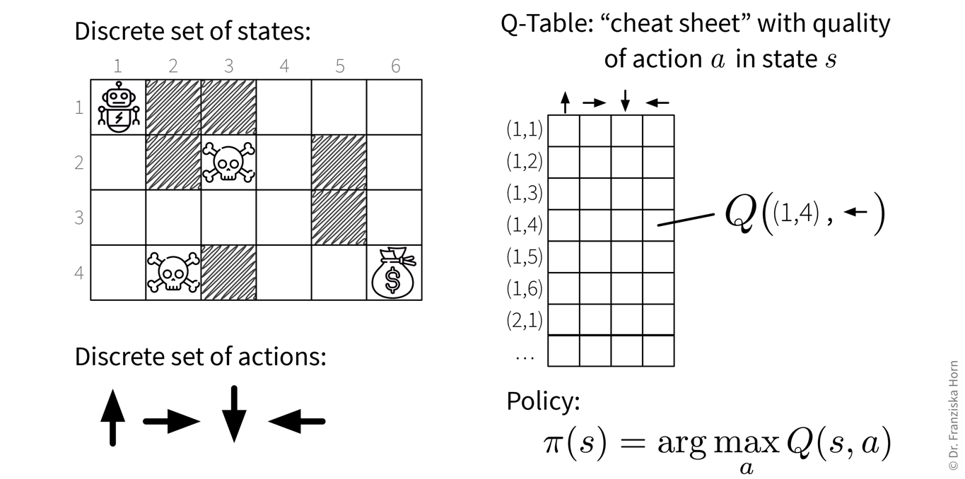 This brings us to the simplest form of RL, tabular RL, where an agent has a finite set of actions to choose from and operates in an environment with a finite set of states (like the grid world from above). Here, we could simply compute the Q-value for each (state, action)-combination as described above, and save these values in a big table. This so-called Q-table then acts as a cheat sheet, since for each state the agent is in, it can just look up the Q-values for all of the available actions and then choose the action with the highest Q-value (when in exploitation-mode):