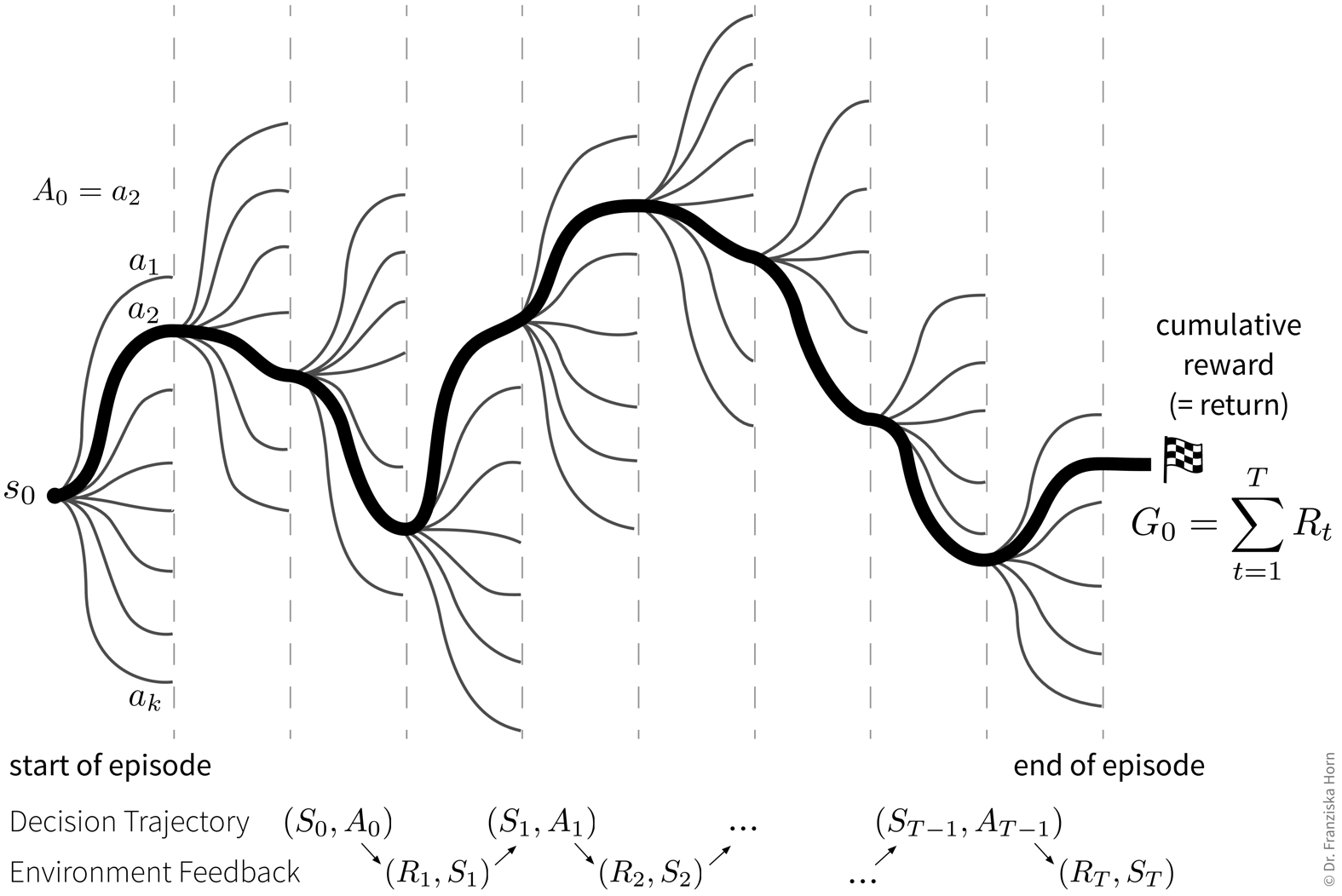 The agent’s decision trajectory basically defines one path among a bunch of different possible parallel universes, which is then judged in the end by the collected return: