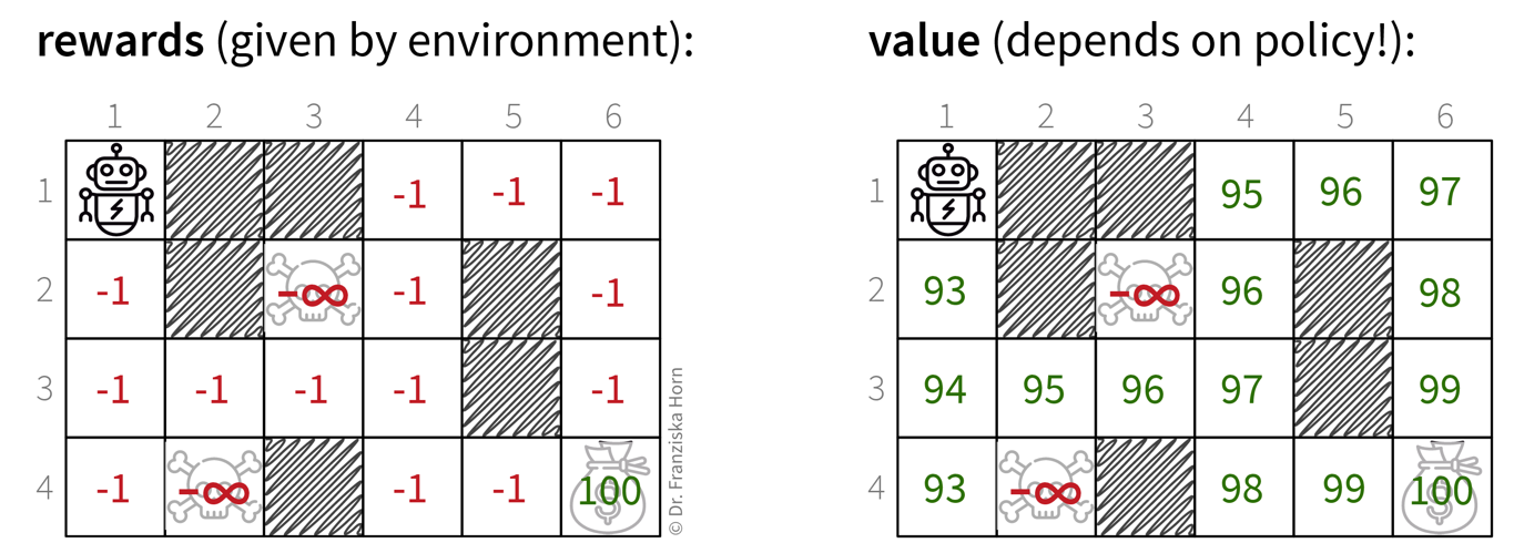 To make decisions that are good in the long run, we’re more interested in what being in a state means w.r.t. reaching the final goal instead of receiving immediate rewards: