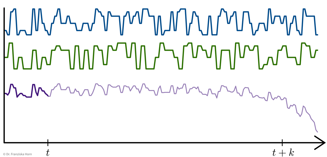 Depending on how complex the dependencies are between the process values over time, it will be more or less complicated to construct feature vectors that capture all the relevant information to make accurate predictions. In general, one should always try to come up with features that contain all the relevant information about the past, i.e., that fulfill the Markov assumption that given this information the future is otherwise independent of the history of the process: For example, if we knew the number of hours a light bulb was turned on up to now, we would have a complete picture about the state the light bulb is currently in; everything else that happened in the past, like how many people were in the room while the light was on, is irrelevant for the state of the light bulb. Another example is the current position of pieces on a chess board: To plan our next move, we don’t need to know the exact order in which the pieces were moved before, but only the position of all the pieces right now.