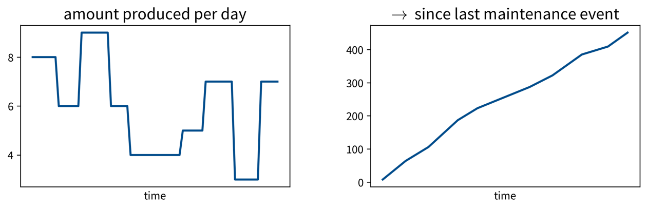The third case are prediction tasks for which it is necessary to consider very long time windows, often of varying lengths, with some complex long-ranging dependencies between the process conditions at different time points. For example, in some predictive maintenance tasks, the decay of the critical process component might not happen in some linear fashion (unlike, for example, a light bulb, which might have some fixed life expectancy and one only needs to count the number of hours it was turned on up to now to estimate when it needs to be replaced). Instead, there exist more complex dependencies, for example, the component might decay faster if it is already in a poor state. Therefore, if some unfortunate combination of process conditions lead to a strain on the component early on, it might have to be replaced a lot sooner than under otherwise identical conditions without this initial mishap, i.e., the order of events matters a lot, too.