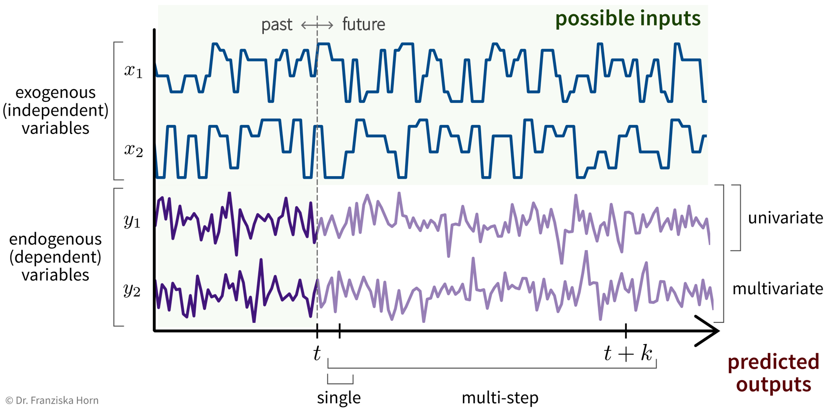 Multivariate, multi-step prediction: \[ [\underbrace{\quad y_1 \quad | \quad y_2 \quad}_{t' \,\leq\, t} | \underbrace{\quad\quad x_1 \quad\quad | \quad\quad x_2 \quad\quad }_{t+1\, ...\, t+k} ] \; \to \; [\underbrace{\quad\quad y_1 \quad\quad | \quad\quad y_2 \quad\quad }_{t+1\, ...\, t+k}] \]